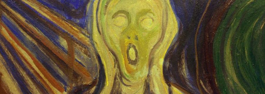 Der Schrei (Edvard Munch) * Also; gestern stehe ich von meinem Platz in der Sonne auf, um mir im Gartenhaus eine frische Flasche Bier zu holen und da höre ich draußen auf dem Weg einen Typen, wie er auf eine Frau mit einem Hund an der Leine einredet. Und er gibt immerzu und ohne Pause …